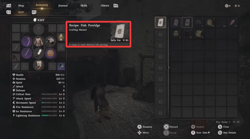 Locate the crafting manual that contains the fish porridge recipe. This is automatically added after accepting the quest.