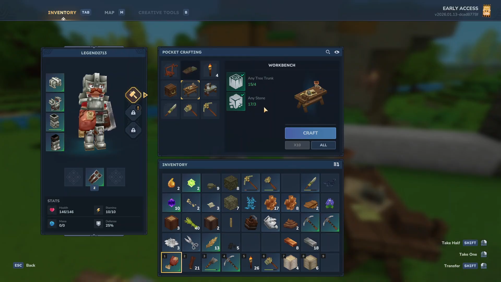 First, open your pocket crafting menu with the Tab key and create a standard Workbench using four tree trunks and three stones.