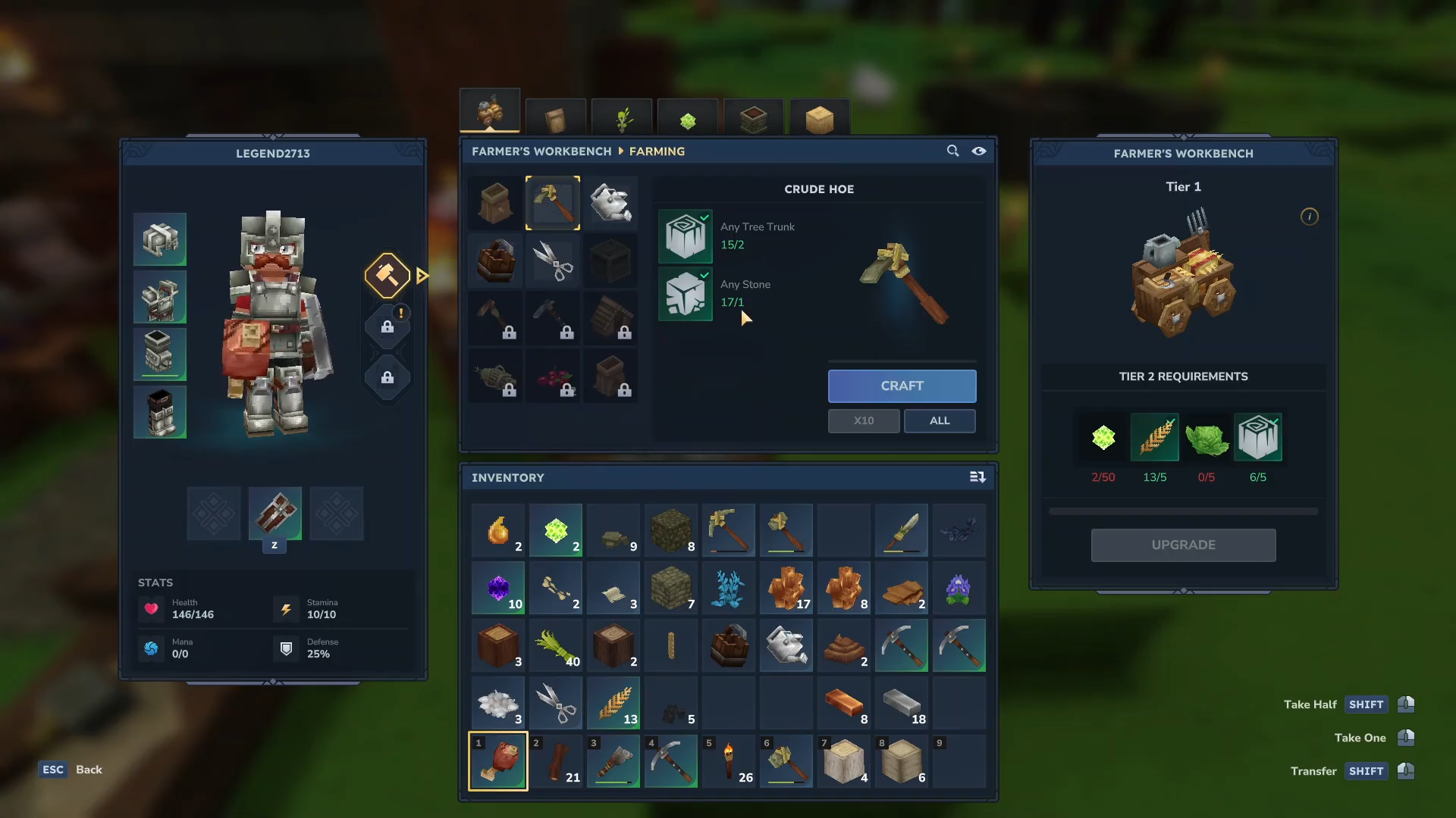 - Once you have access to the Farmer’s Workbench, a hoe costs two tree trunks and one stone