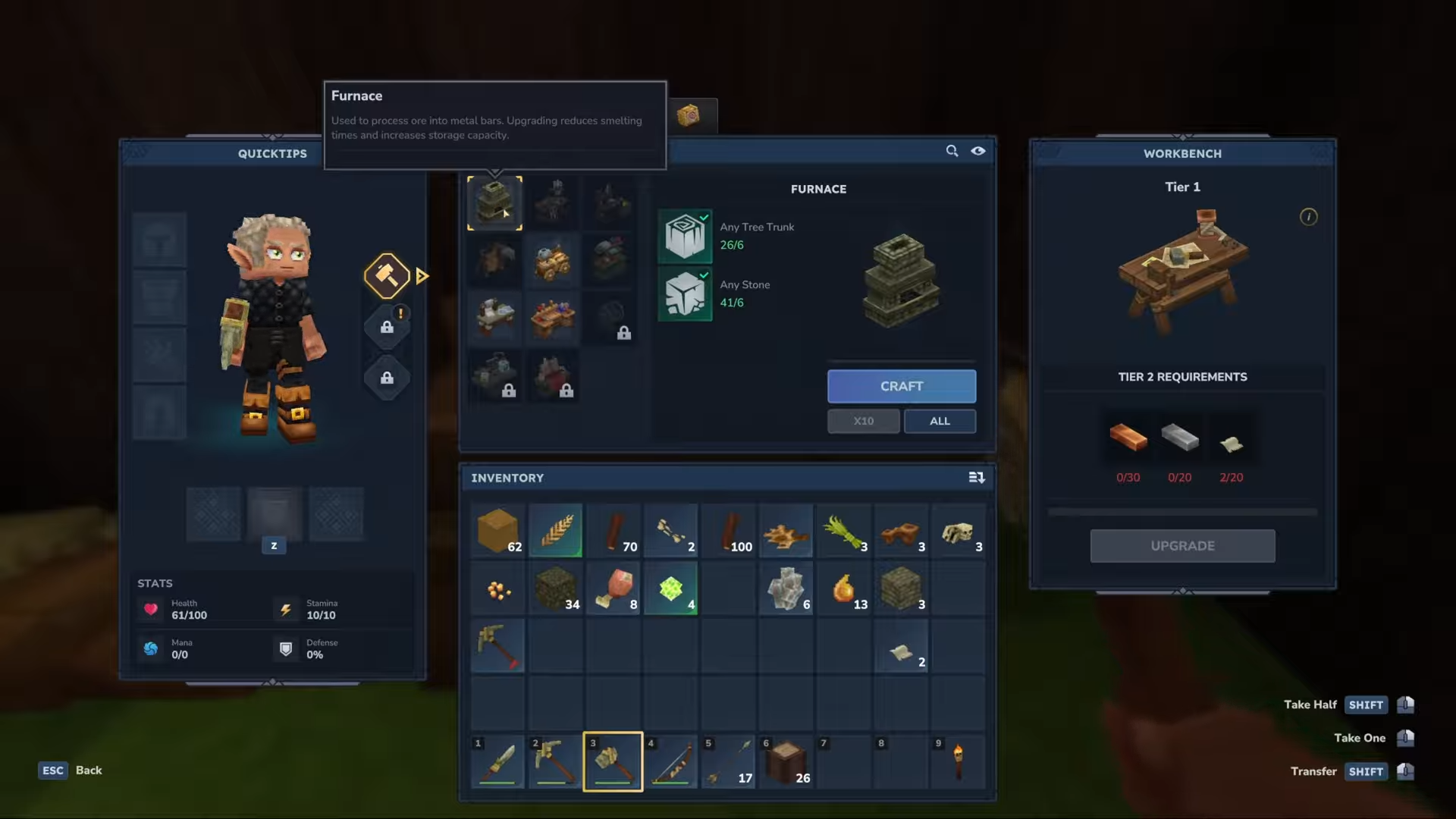 Before you can build a furnace, you’ll need a workbench. If you haven’t already, you can easily build one from your basic crafting area. Interact with your workbench to open the crafting menu.