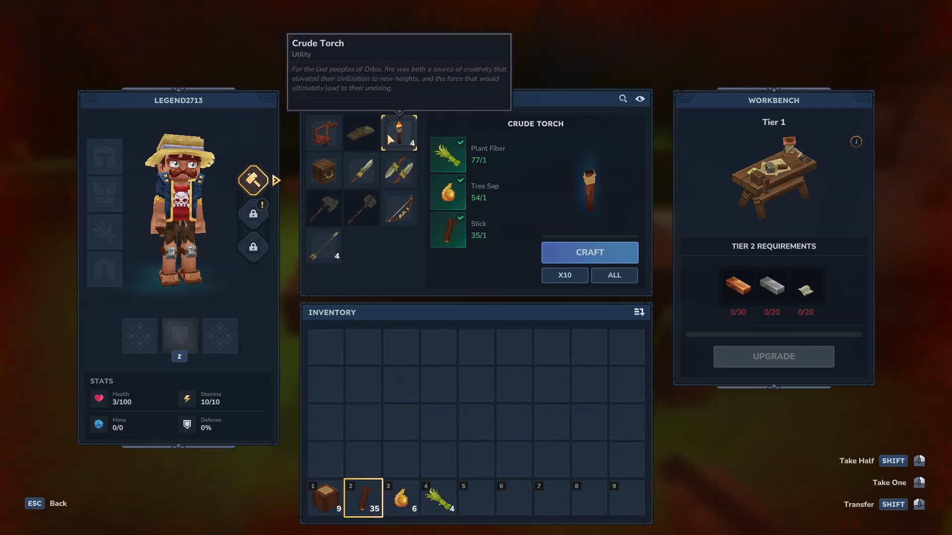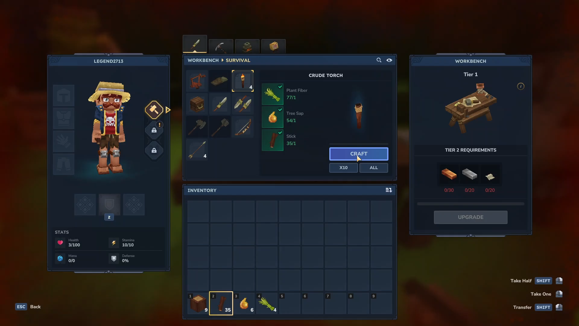 - Select the crude torch recipe and click “Craft” to create light sources that can be placed anywhere