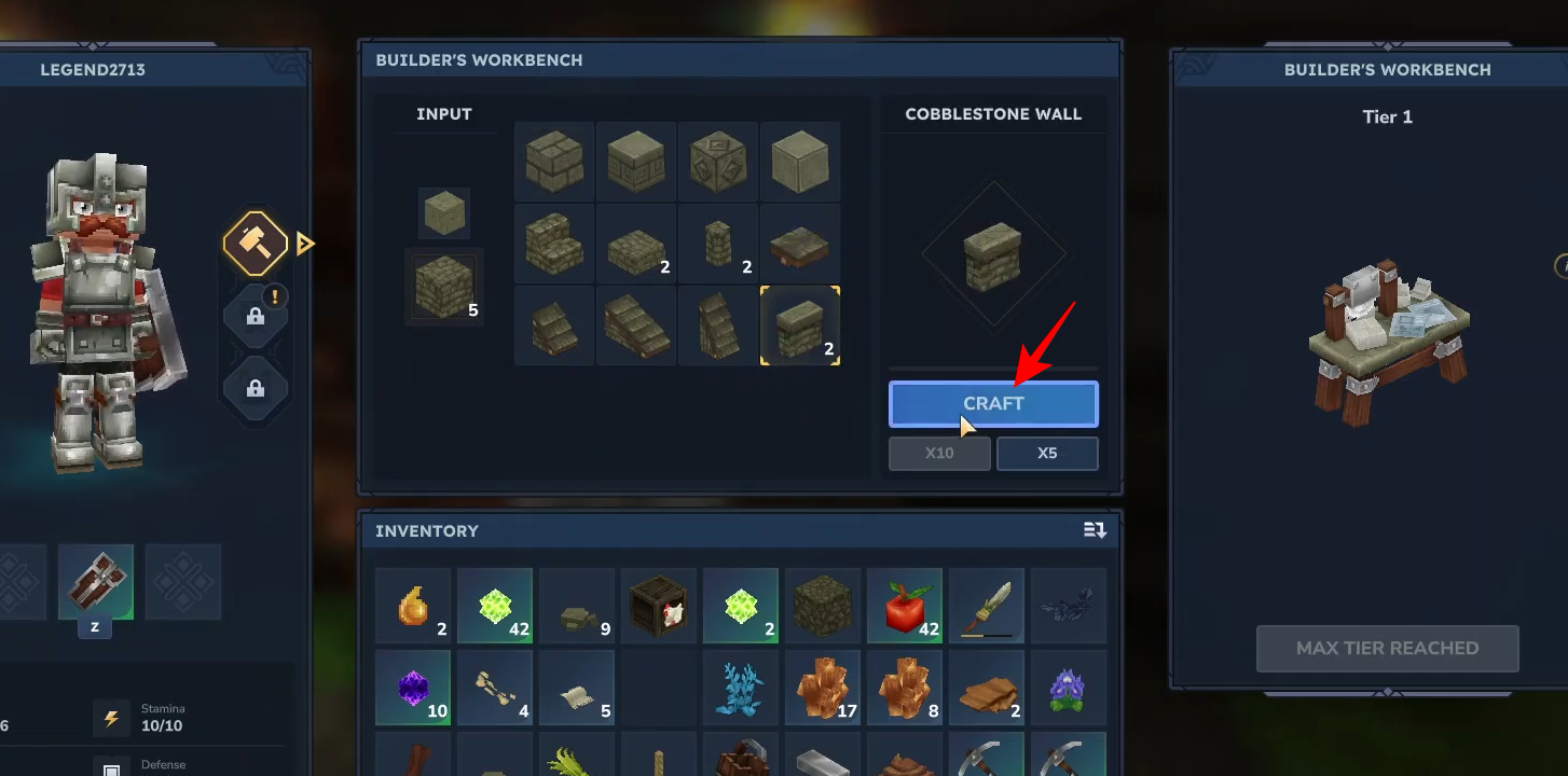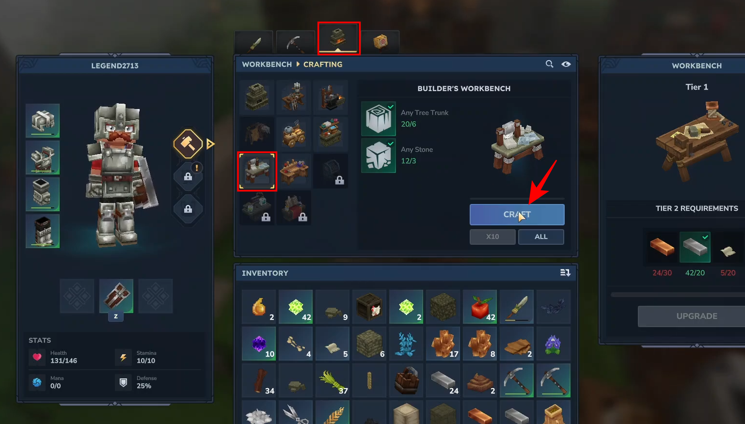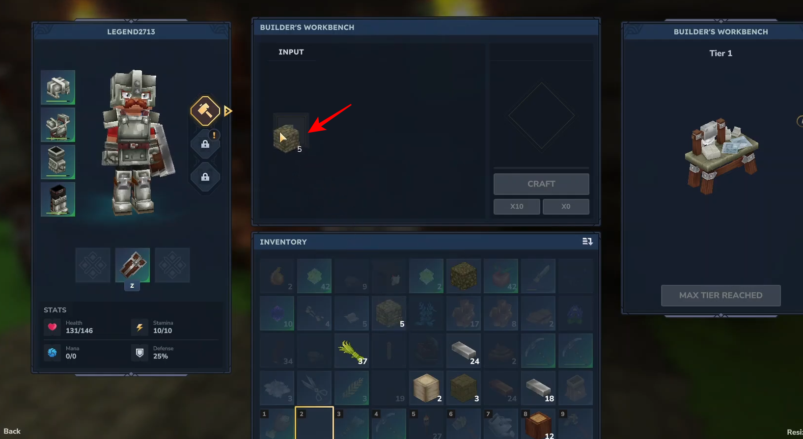 Select the Builder’s Workbench icon—requiring 6 tree trunks and 3 stone—and craft it.
