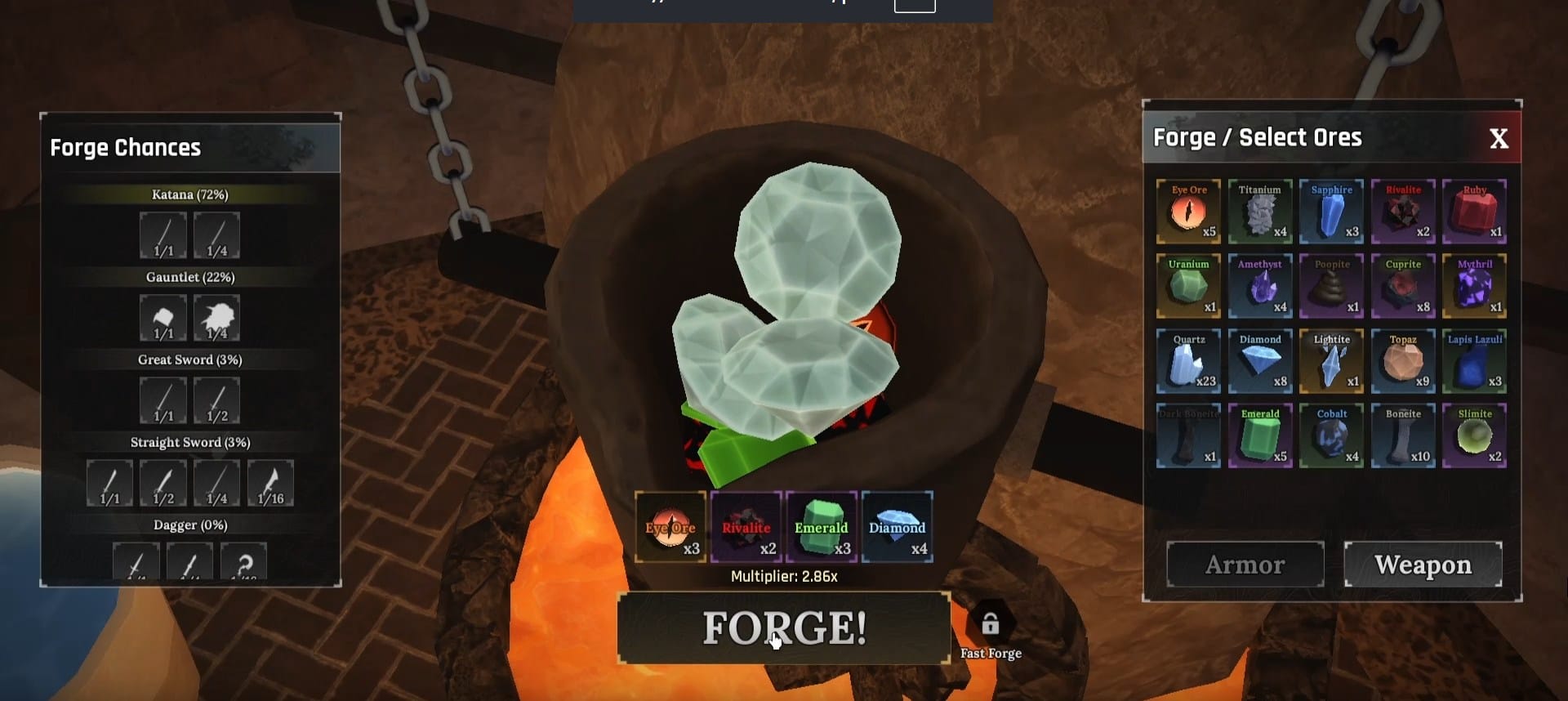 Ironhand is a weapon in the Forge game that belongs to the gauntlet class. You must have 17% Rivalite, 25% Emerald, 25% Eye Ore and 33% Diamond to craft it.