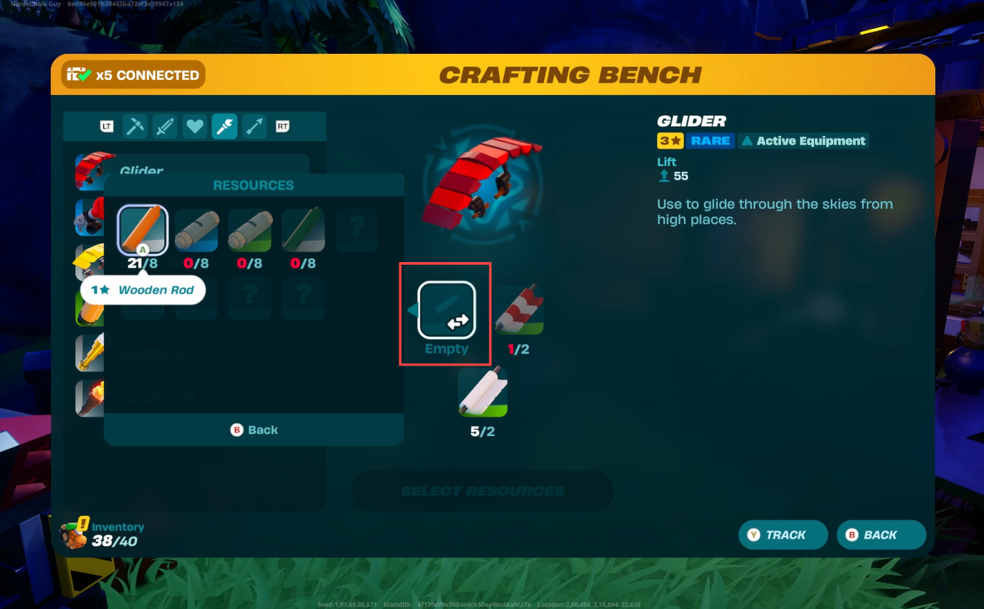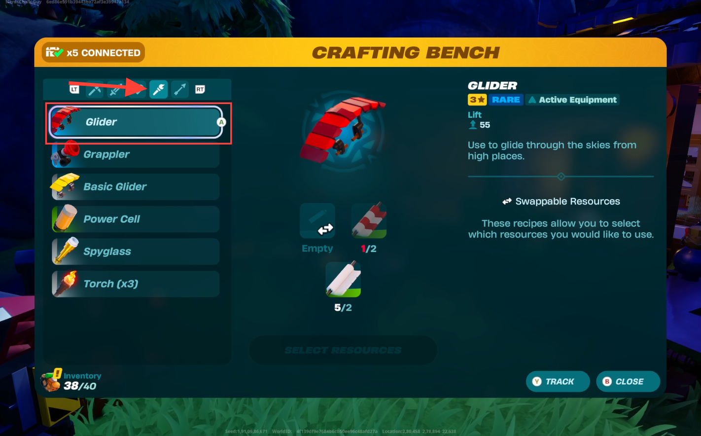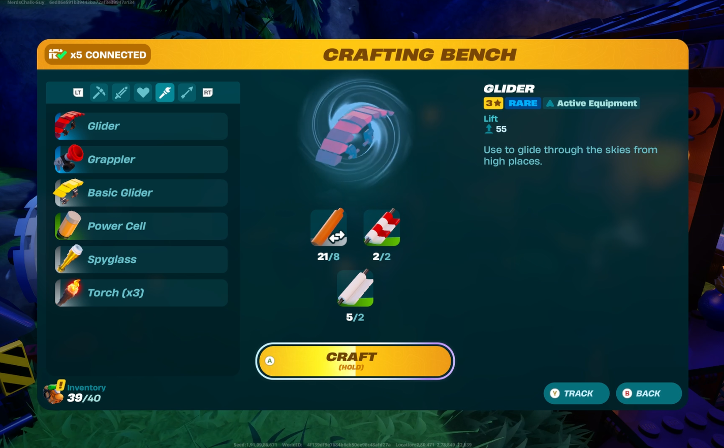 Once all required materials are prepared, return to the Crafting Bench and press and hold the Craft button to complete the Glider.
