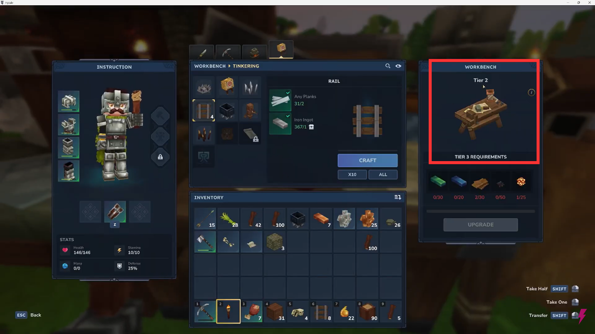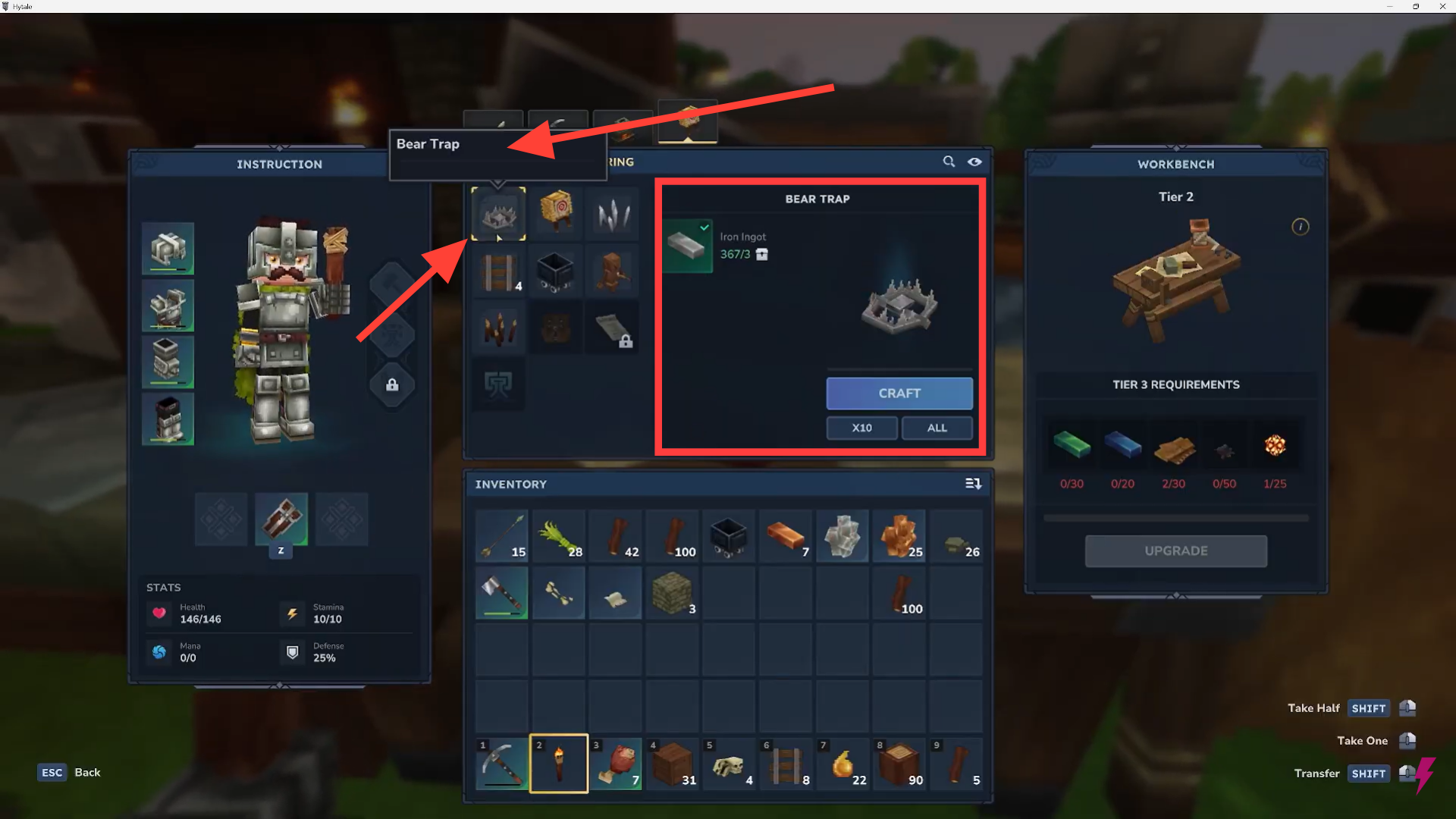 Mine iron ore and smelt it into iron ingots. Open the Tier 2 workbench crafting menu.