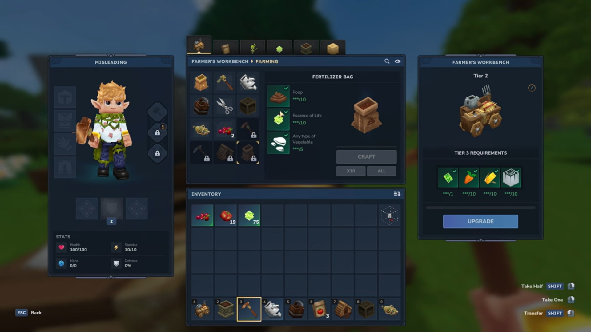 To craft a Fertilizer Bag, you’ll need a mix of organic and life-based materials commonly gathered during exploration and farming. You need a Tier 2 Farmer’s Workbench to unlock it.