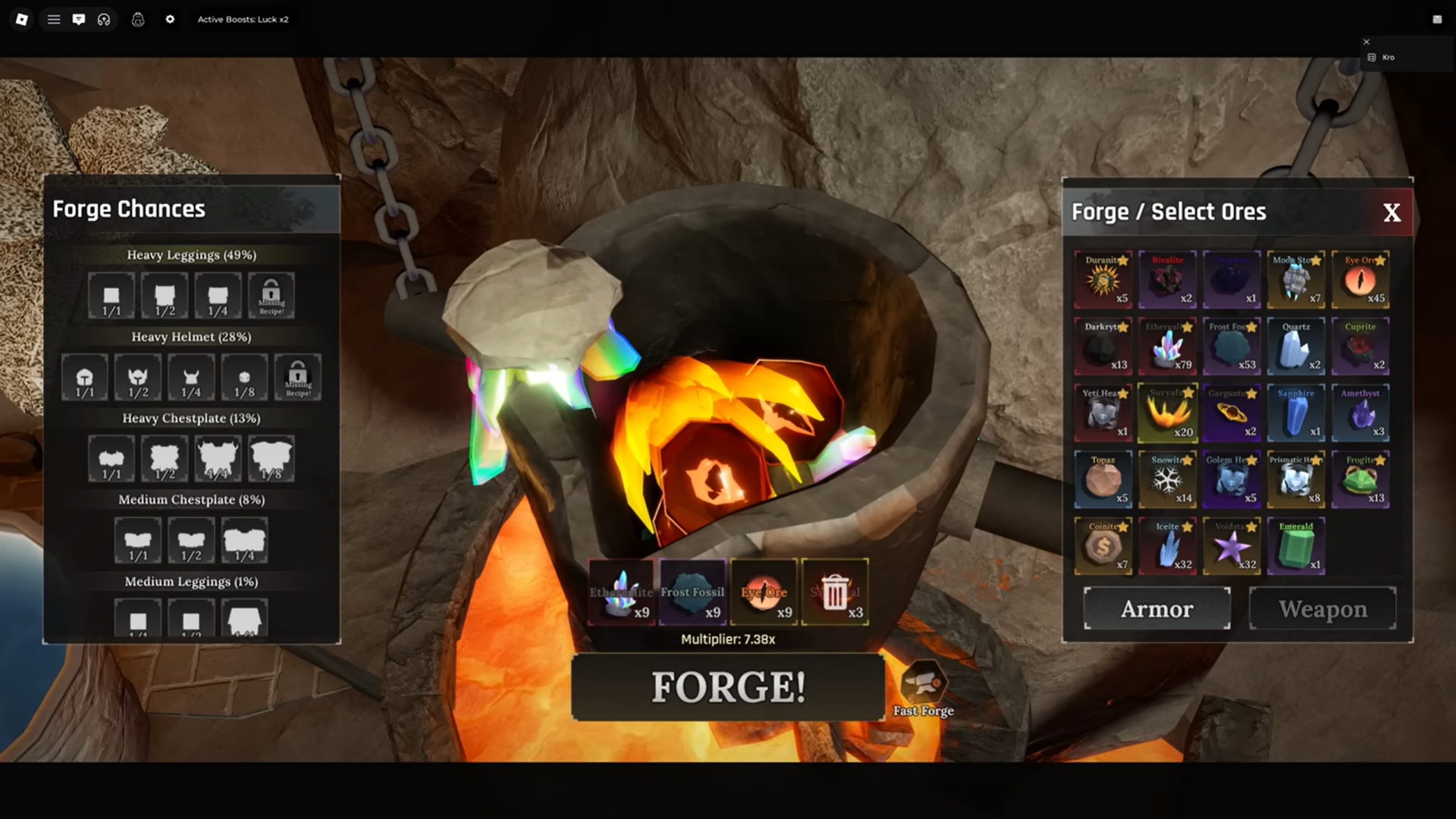 Crafting Damage Armor in The Forge Roblox involves mining specific ores and forging them at the central crucible. You combine quantities of damage-boosting ores like Eye Ore for raw power and Frost Fossil for multipliers, aiming for high-roll results on heavy or knight variants. Recent guides highlight builds exceeding 90% damage boosts as of early 2026.