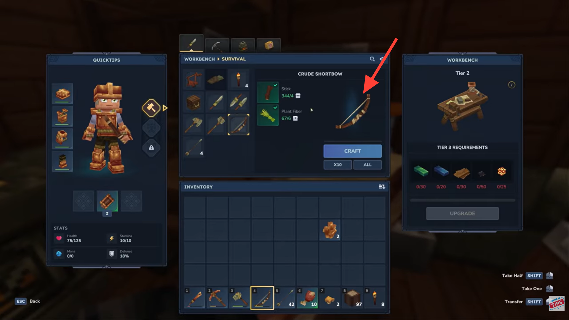 Once you progress a bit further, you’ll unlock more advanced crafting options. With the Blacksmith’s Anvil, you can start crafting arrows, copper bows, crossbows, and stronger ranged weapons.