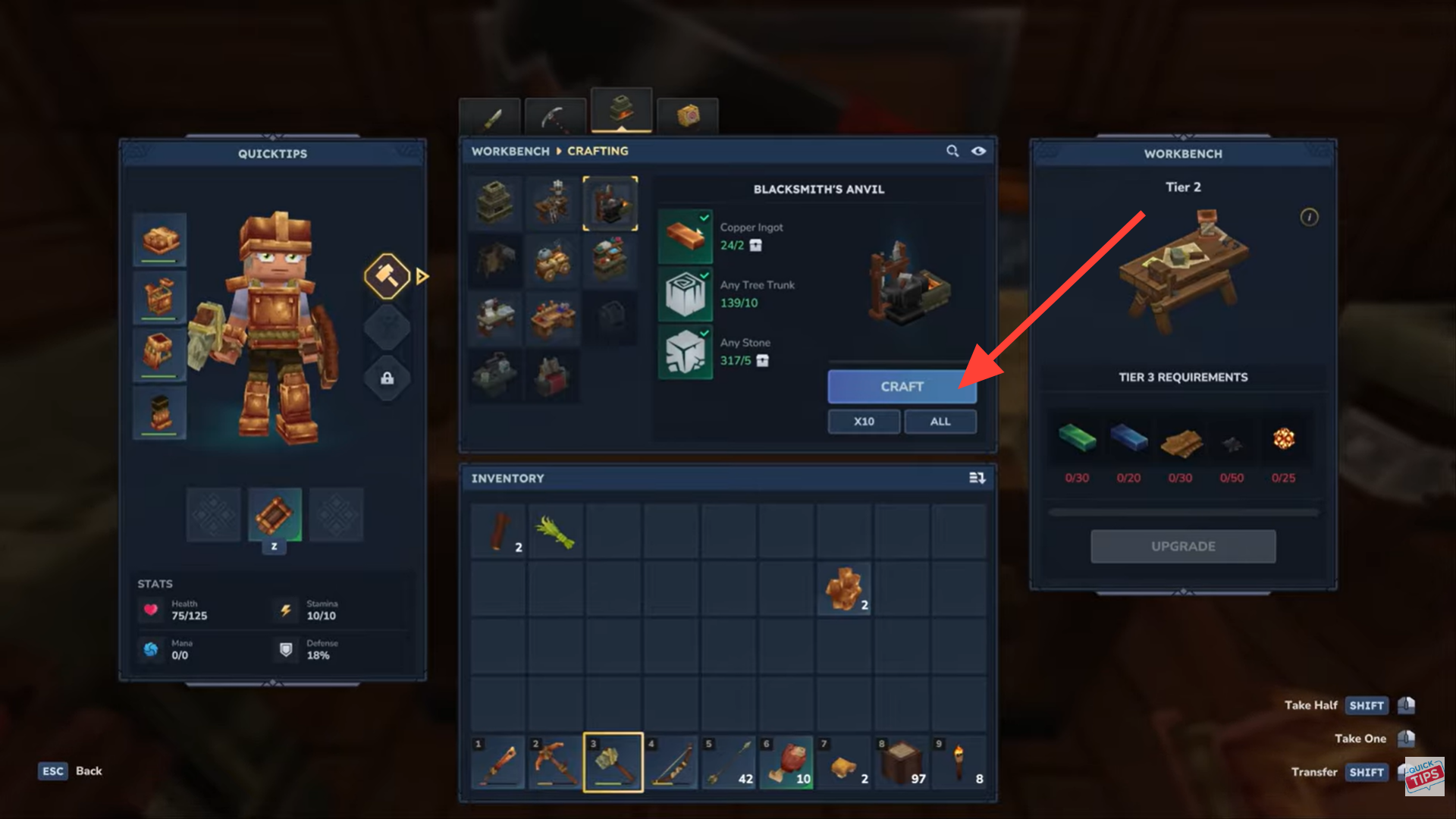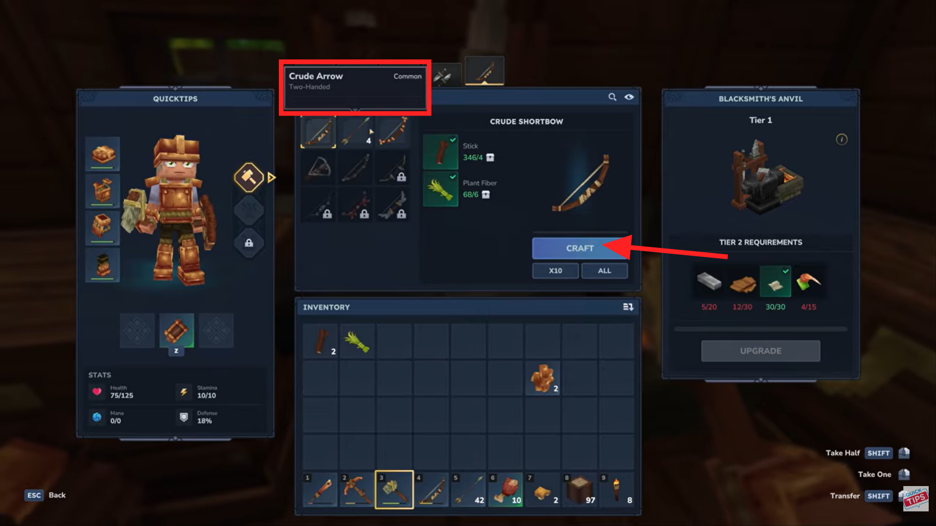 Once you progress a bit further, you’ll unlock more advanced crafting options. With the Blacksmith's Anvil, you can start crafting arrows, copper bows, crossbows, and stronger ranged weapons.
