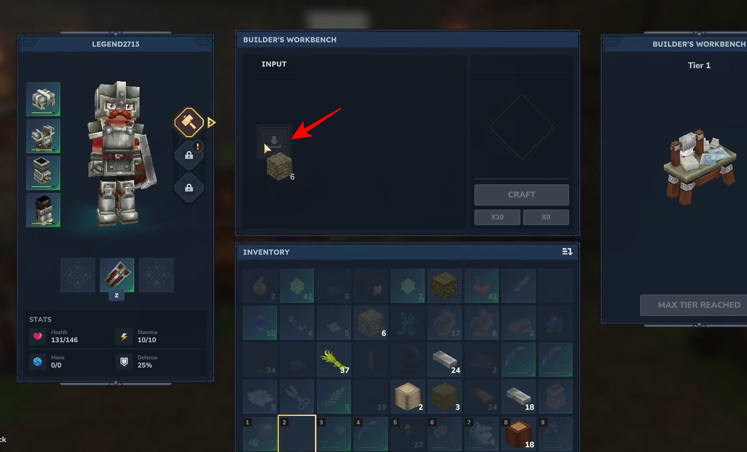 Select the Builder’s Workbench icon—requiring 6 tree trunks and 3 stone—and craft it.