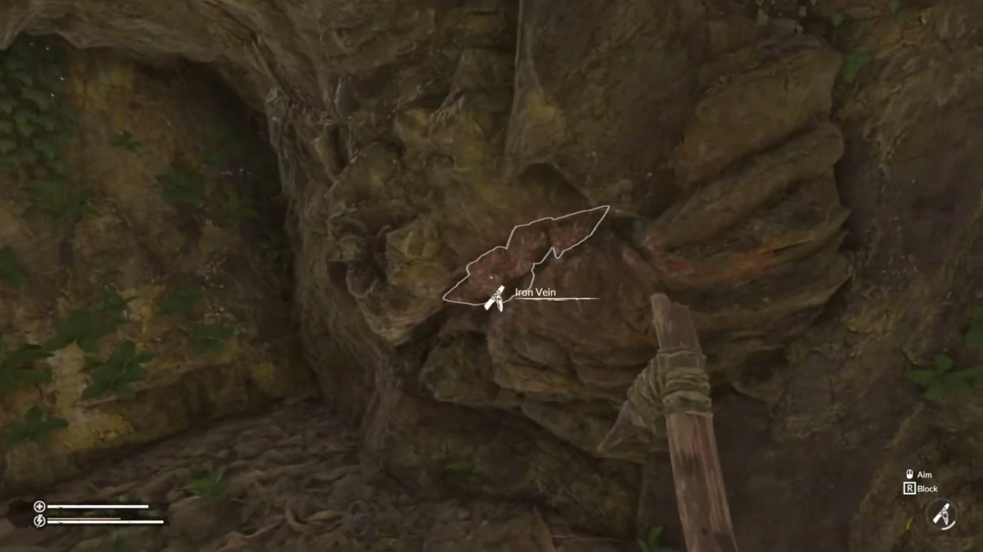 Iron ore veins in caves, mined with a pickaxe to drop raw ore chunks.