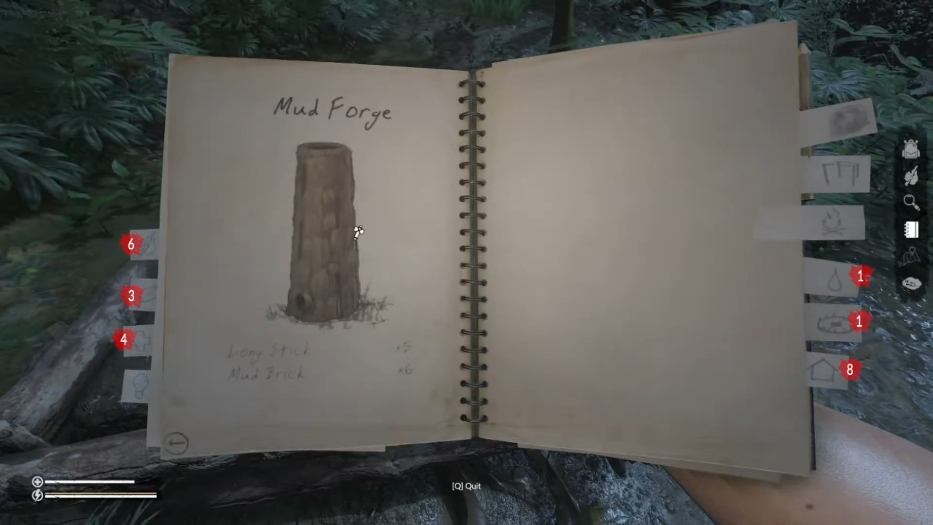 Build the mud forge using 5 long sticks and 6 mud bricks from the notebook’s fire section.