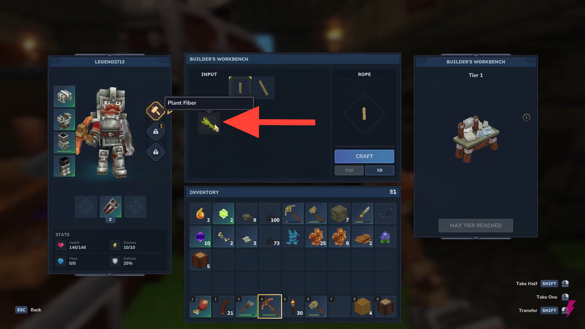 Place the Builder's Workbench and interact with it to ppen the crafting menu, and place some Plant Fibers into the Input.