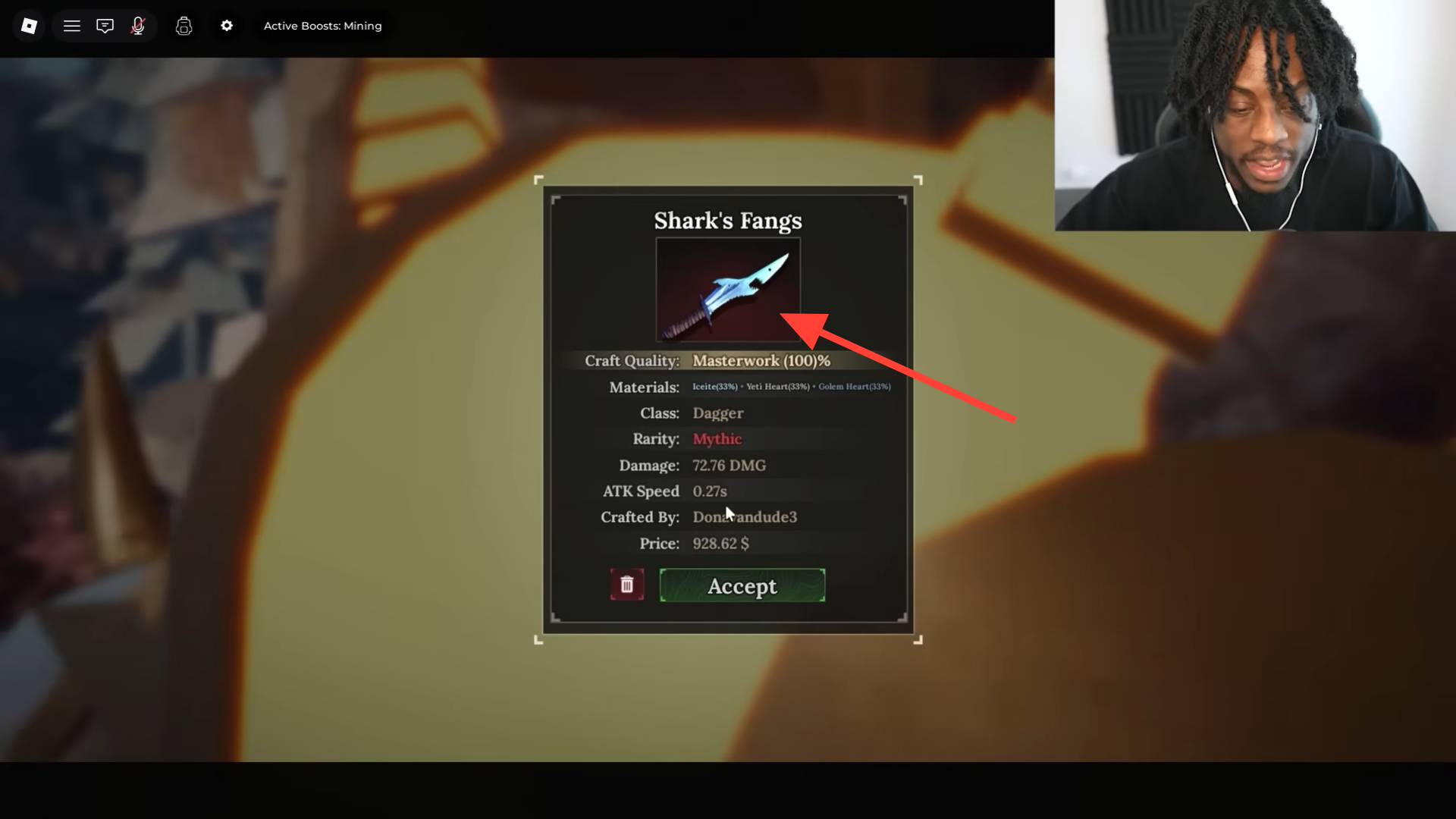 Confirm the craft. If the dagger pool rolls correctly, you’ll receive Shark’s Fang Dagger. If not, you may need to re-farm and try again.