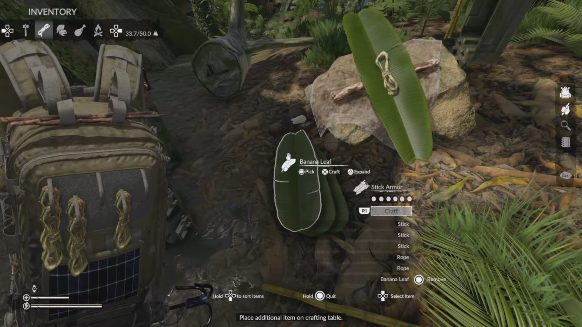 In the crafting menu, combine 1 banana leaf + 3 sticks + 2 ropes.