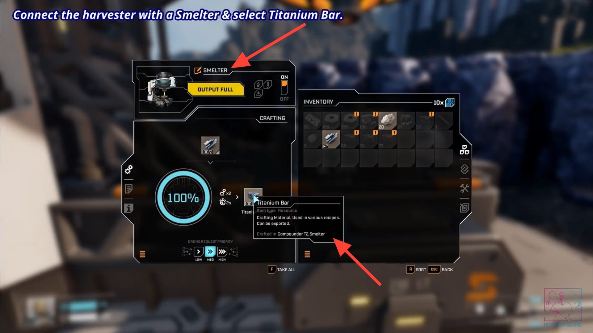 Before turning titanium into rods, you’ll usually process it into bars. Place Titanium Ore into a Smelter. Wait for the Smelter to process the ore into Titanium Bars. Store bars nearby or route them directly to your Fabricator for automation.