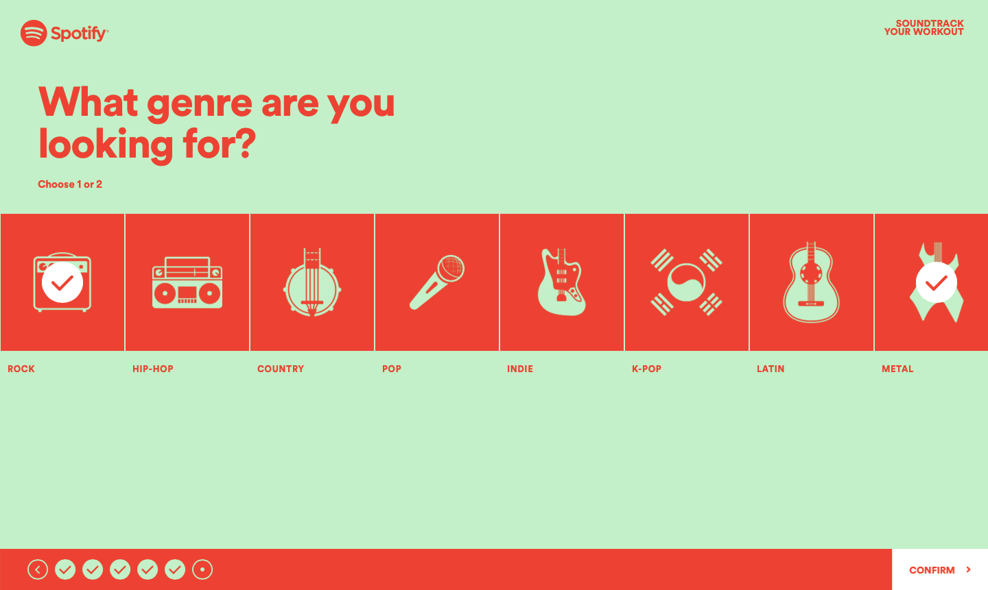 Spotify will now ask you to select a genre that you want your playlist to include. You can choose one or a multiple of genres depending on what you want to listen from Rock, Hip-hop, Country, Pop, Indie, K-Pop, Latin, and Metal. Verify your preferences by clicking the ‘Confirm’ button at the bottom right.