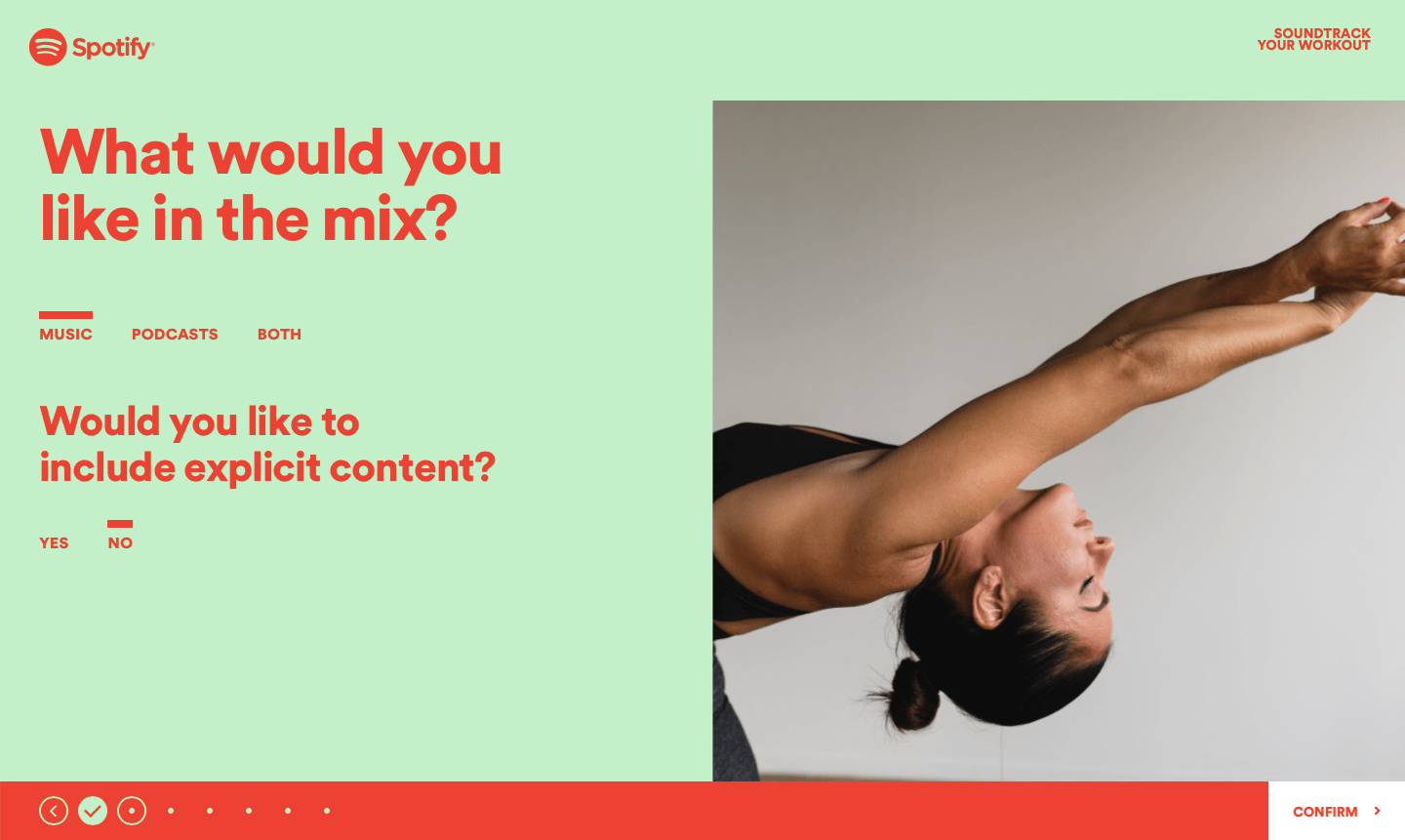In the next screen, select whether you want this workout playlist to feature explicit content or not. You also get the option to choose only music, only podcasts or both music and podcasts to be included in the playlist. Click on the ‘Confirm’ button at the bottom right to proceed to the next screen.