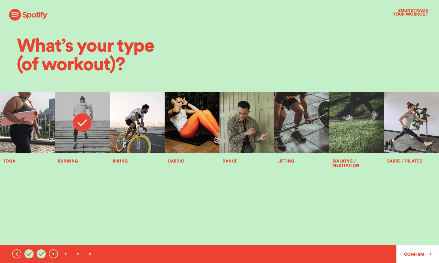 Now you are given a chance to tweak your playlist depending on the type of workout you’re getting in to. You can choose one option from yoga, running, biking, cardio, dance, lifting, walking/meditation, and barre/pilates. Confirm your choice to move on to the next setting.
