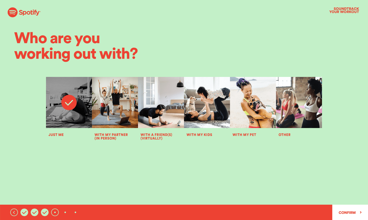 You will now be asked if you’re exercising on your own or with someone else. Your playlist will change depending on whether you choose to work out with someone else virtually, with your pet or a baby. Click on the ‘Confirm’ button at the bottom right to proceed to the next screen.