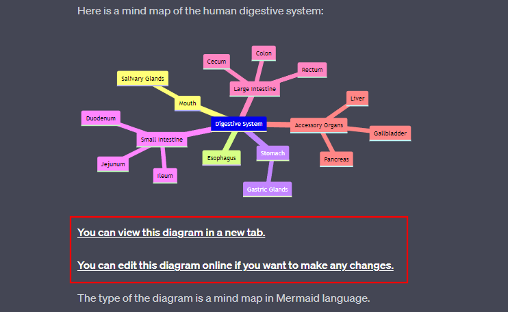 Next, let’s see how the Show Me plugin can create mind maps. For this example, we want to get a mind map for the human digestive system, the prompt for which can look something like this: