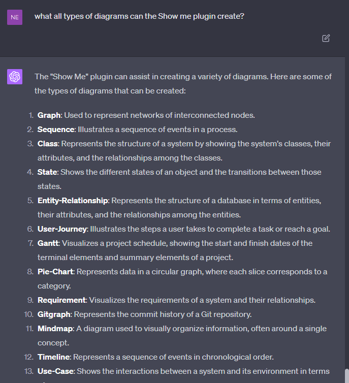 The Show Me plugin on ChatGPT is one of the better tools that you can use to create diagrams, mind maps, pie charts, and a whole lot more using diagram languages like Mermaid and PlantUML.