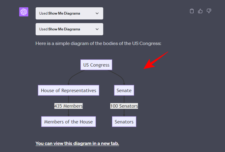 Within the ‘Diagram’ category itself, there are a few different forms that you can ask ChatGPT to create using the Show Me plugin. Let’s first start with a simple diagram with the use of a simple prompt. In this example, we want ChatGPT to provide a simple diagram to help us understand the bodies of the US Congress.