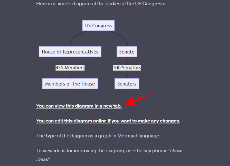 As before, you can view the diagram in a different tab, as well as edit it online if you’d like to make changes to it by clicking on the hyperlinks provided by ChatGPT.