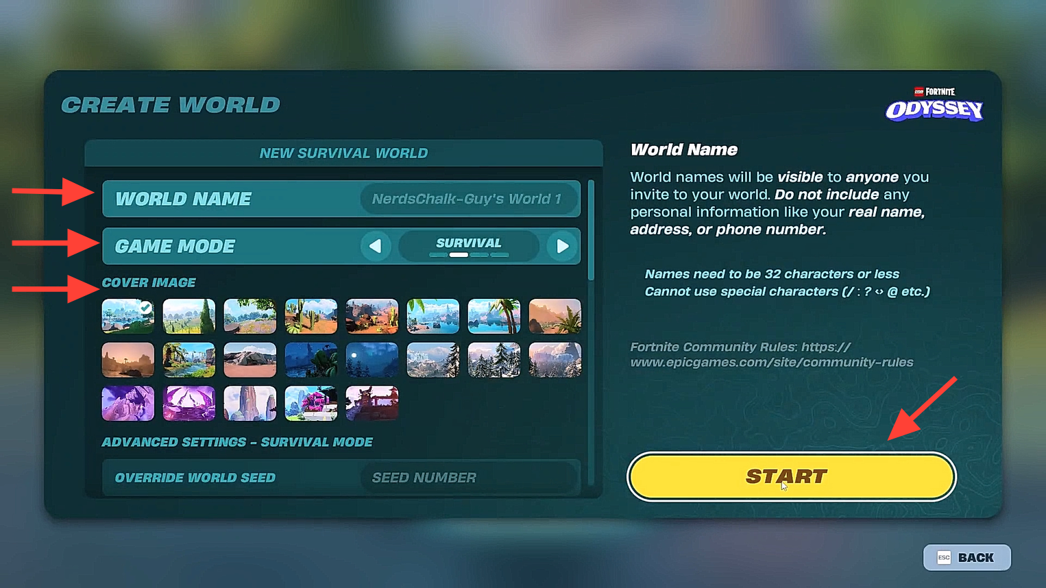 Give your world a name, and select the game mode from Survival, Sandbox, Cozy, or Expert. Also, add a cover image for your world. Click Start, then click Okay on the next prompt. Your World will be created.