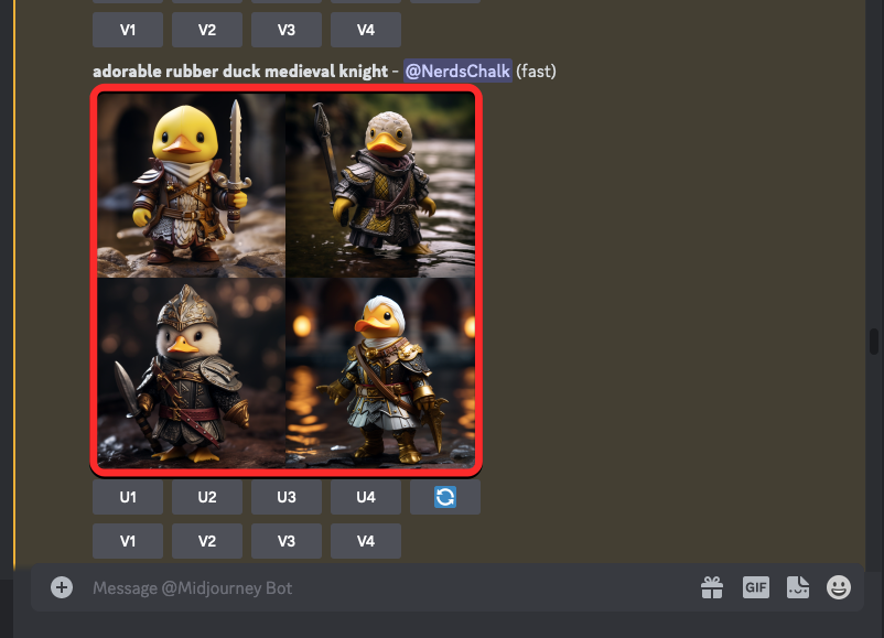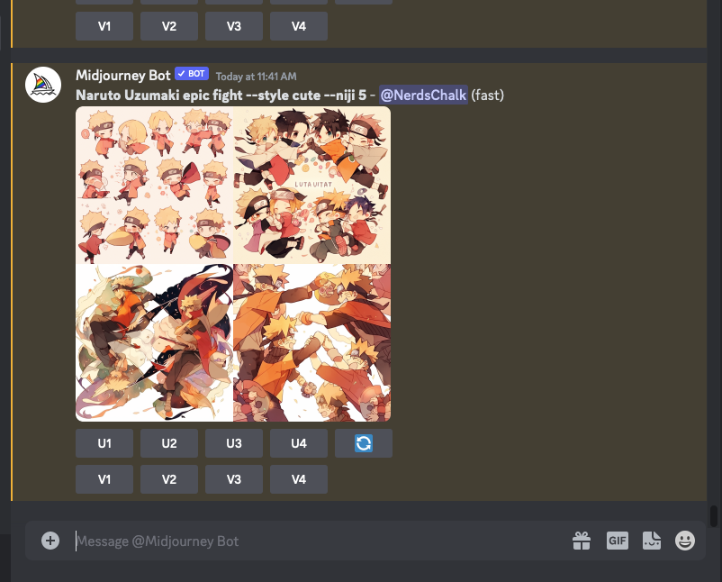 When you do that, the Midjourney Bot will start processing your prompt and generate images based on it. Once it’s done processing, you should see a set of 4 images based on your description and the selected Niji model.