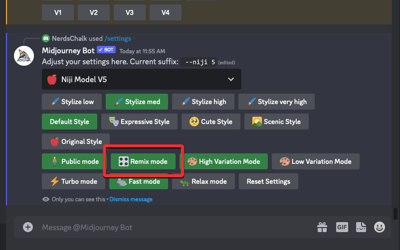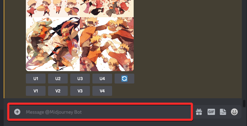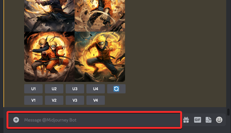 Before you can modify your previous images on Midjourney using Niji 5, you need to activate Remix Mode on your account. To do that, open any of Midjourney’s servers on Discord, or access the Midjourney Bot from your Discord Server or Discord DM. Regardless of how you access it, tap on the text box at the bottom.