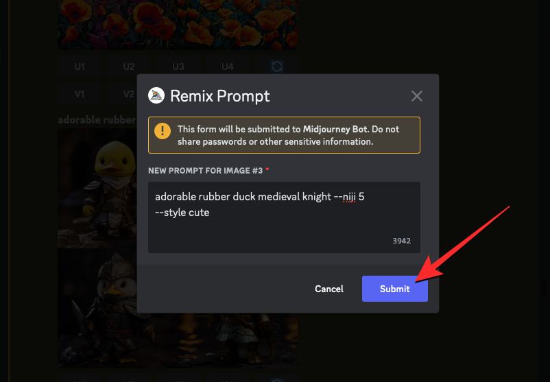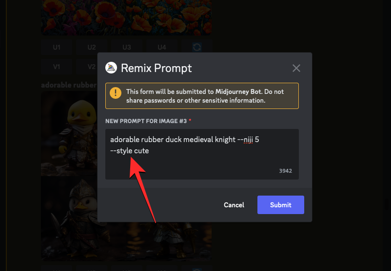 When you click on a variate option, you’ll see the Remix Prompt box on the screen. Since you wish to recreate the image using Niji 5, you can add the --niji 5 parameter at the end of your prompt inside this box.
