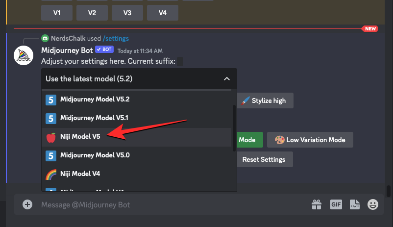 When the menu expands, click on Niji Model V5.which is the latest version of Niji at the time of writing. You can select a new version from this menu when available.