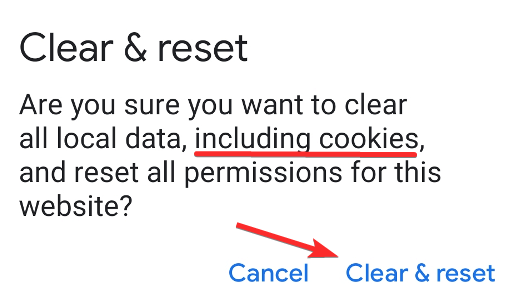 A dialogue box will inform you that you are about to clear local data and cookies and reset the permissions. Select Clear & reset to continue.