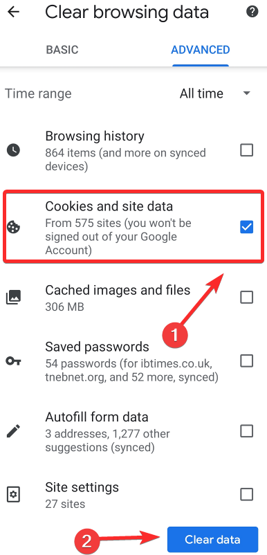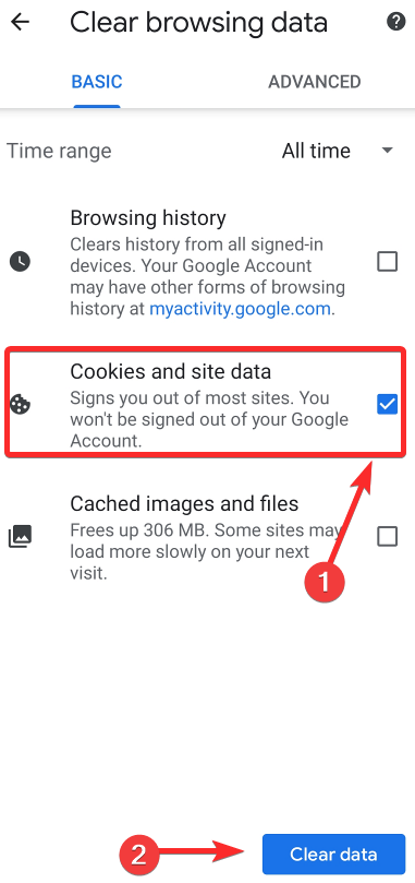 If you do not want to get logged out of your Google account but want to remove cookies then tap on the Advanced tab instead of basic.