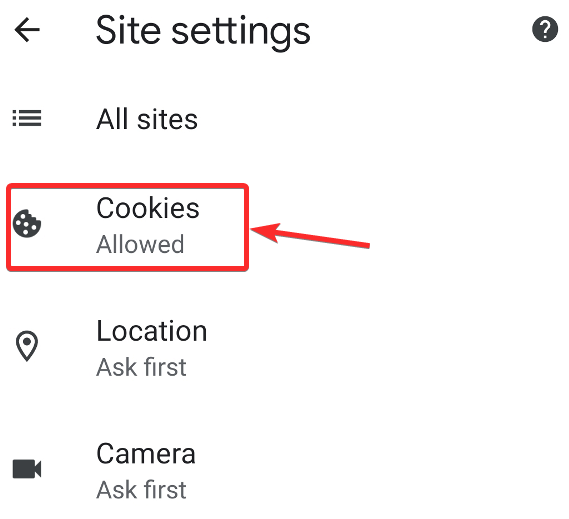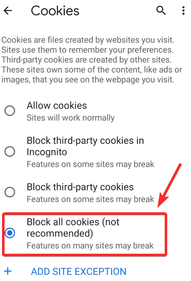 Under the settings option, you can find “Cookies”, here you can block or disable your device from downloading cookies from all websites or from particular websites.