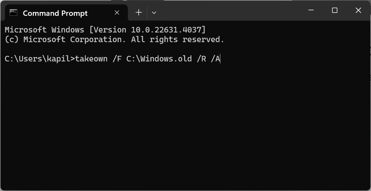 2. Type and enter the following command: takeown /F C:\Windows.old /R /A