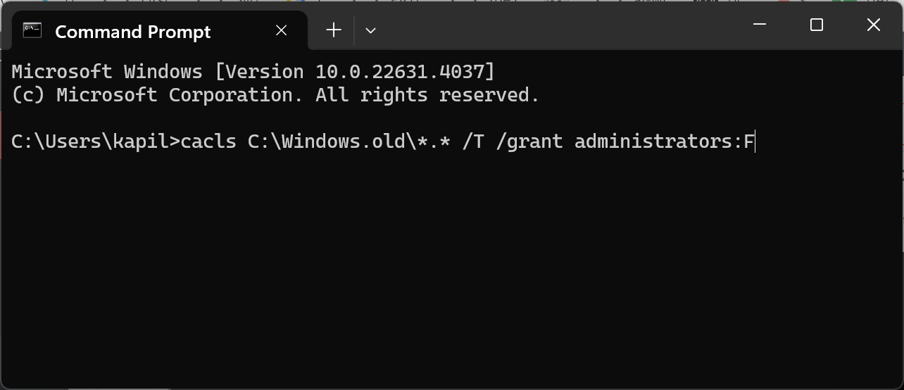 5. Now enter this command: cacls C:\Windows.old\*.* /T /grant administrators:F