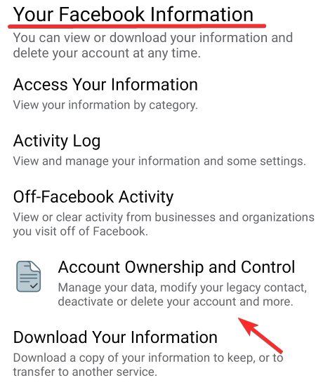 Scroll down to Your Facebook Information. Tap on Account Ownership and Control