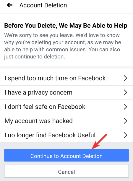 You will be asked why you want to delete your account. To proceed without choosing any options, tap the Continue to Account Deletion button again.