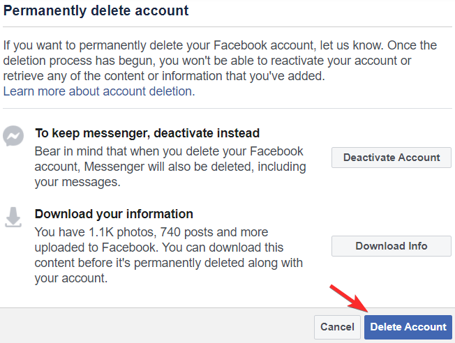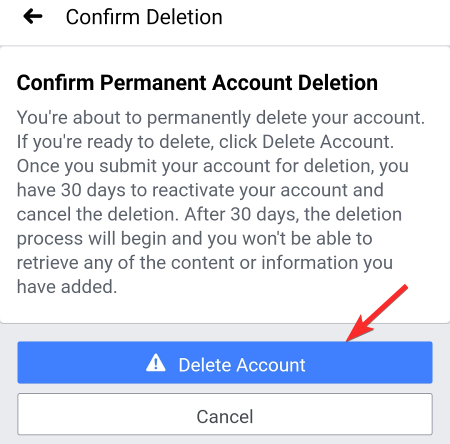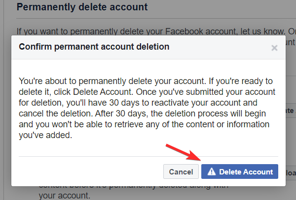 Now that you have your files and media copied, you can without hesitation hit the delete button. Your account will permanently get deleted from Facebook after 30-days. Just make sure that you do not log back into your account during the cool-off period.