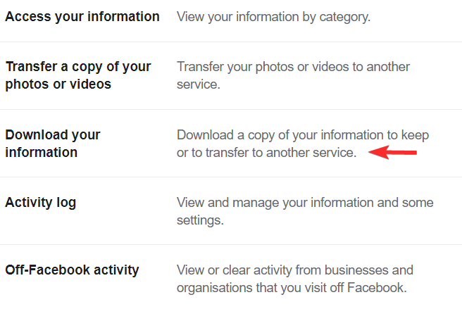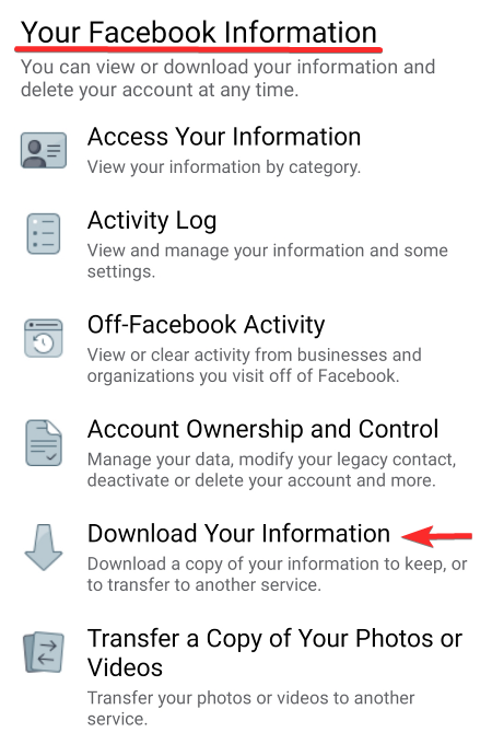Facebook allows you to back-up some of your account’s data at any point in time. You can do this both from the app as well as the website.