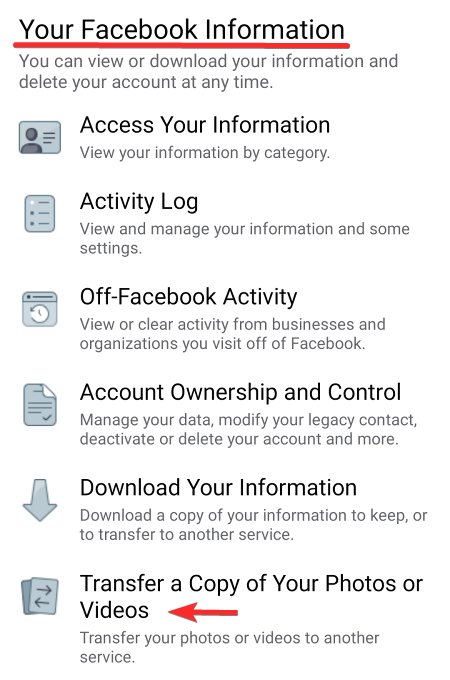 Tap on Transfer a Copy of Your Photos or Videos, under Your Facebook Information