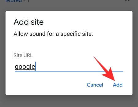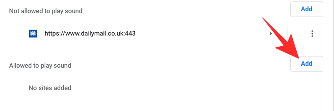 Since the default is not set to ‘Don’t allow sites to play sound,’ you’ll need to click on the ‘Add’ option next to the ‘Allowed to play sound’ banner.