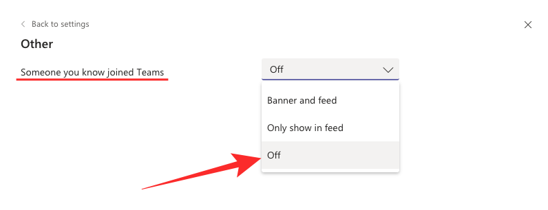 In this screen, click on the options available for the ‘Someone you know joined Teams’ section and select ‘Off’ to stop getting alerted.