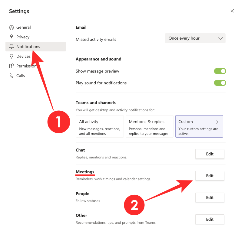 Inside the Settings screen, select the ‘Notifications’ tab from the left sidebar and then click on the ‘Edit’ button adjacent to the ‘Meetings’ section below.