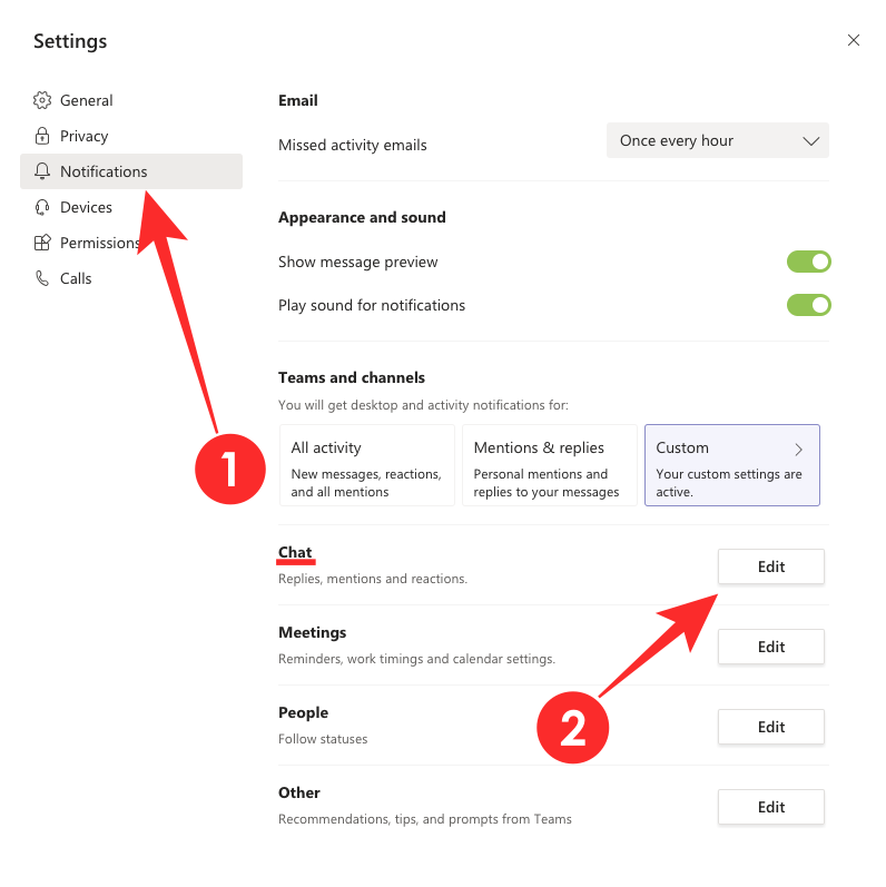 Similar to switching off notifications in a conversation, you can disable alerts sent to you in a chat by going into Teams’ Settings screen. To disable mentions, replies, and reactions from Chat, go to your profile picture > Settings > Notifications, and click on the ‘Edit’ button next to the ‘Chat’ section.