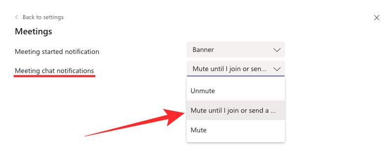 In the next screen, select the ‘Mute until I join or send a message’ option available next to the ‘Meeting chat notifications’ section.