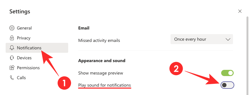 Inside the Settings screen, select the ‘Notifications’ tab from the left sidebar and toggle OFF the switch adjacent to ‘Play sound for notifications’ under the ‘Appearance and sound’.