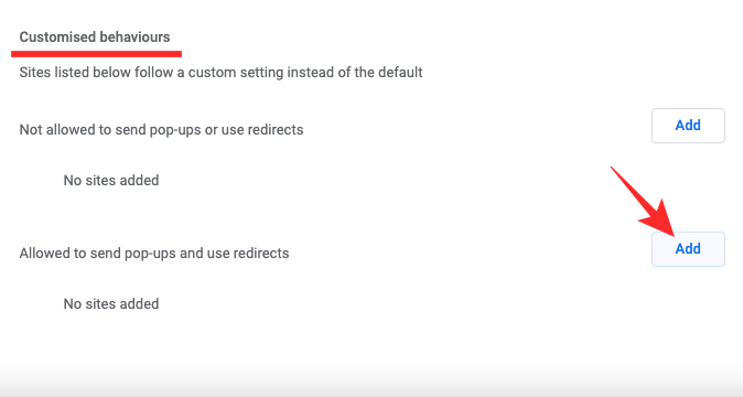 Now, under ‘Customized behavior,’ click on the ‘Add’ option on the right of ‘Allowed to send pop-ups and use redirects.’